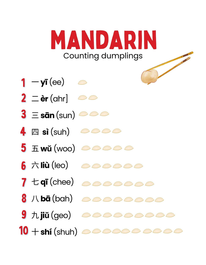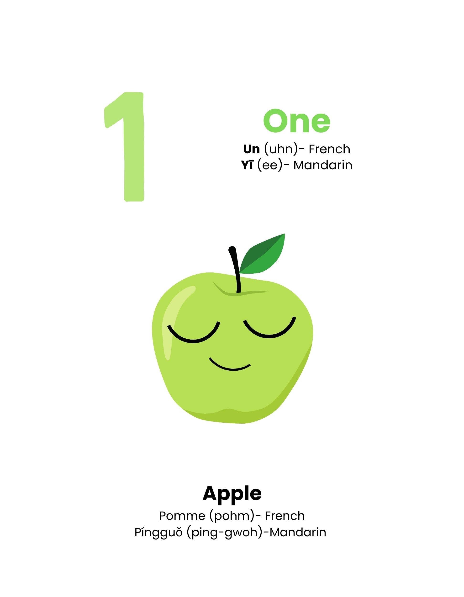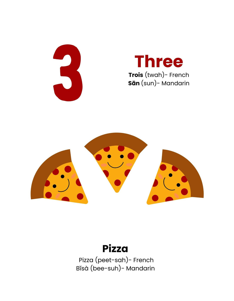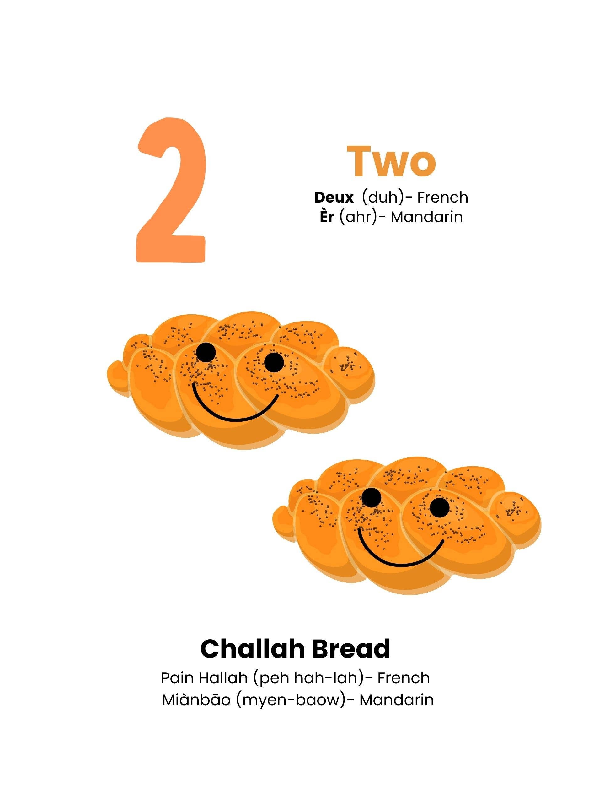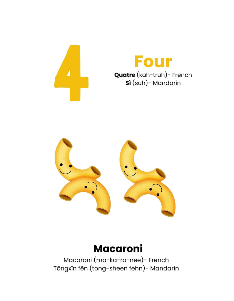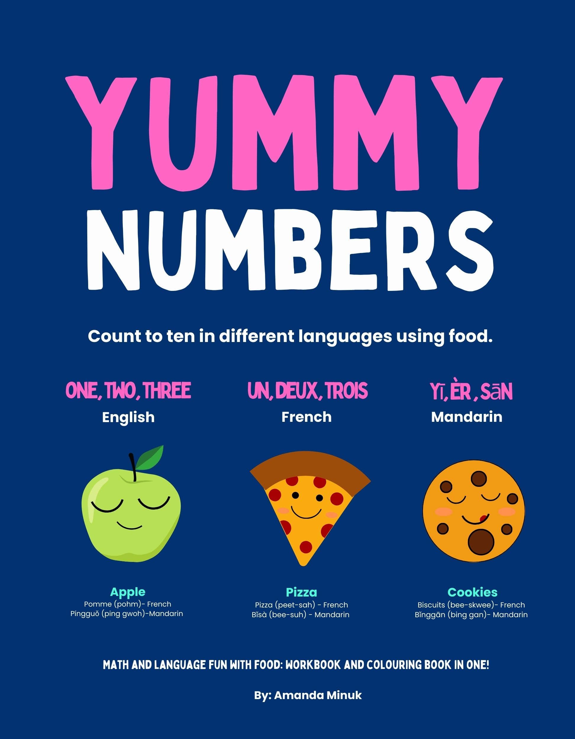 Introduce your child to their first counting book that teaches them counting and foods in multiple languages. Yummy Numbers is a deliciously fun way to learn numbers and new languages with food. From fruits and veggies, to ice cream and pizza, our counting book utilizes foods to practice counting and learning English, French and Mandarin. Kids will also count: Croissants in French, Dumplings in Mandarin, Churros in Spanish, Samosas in Hindi, Challahs in Hebrew, Sushi in Japanese, Pizzas in Italian Children are exposed to new and familiar foods with pictures and fun facts- expanding their palettes and vocabulary. And that's not all! Math skills are also developed and enhanced with Yummy Numbers. From an age-appropriate lesson on fractions to interactive math activities such as number matching, adding, subtracting to tracing and writing numbers. This book also includes 20 pages of colouring.