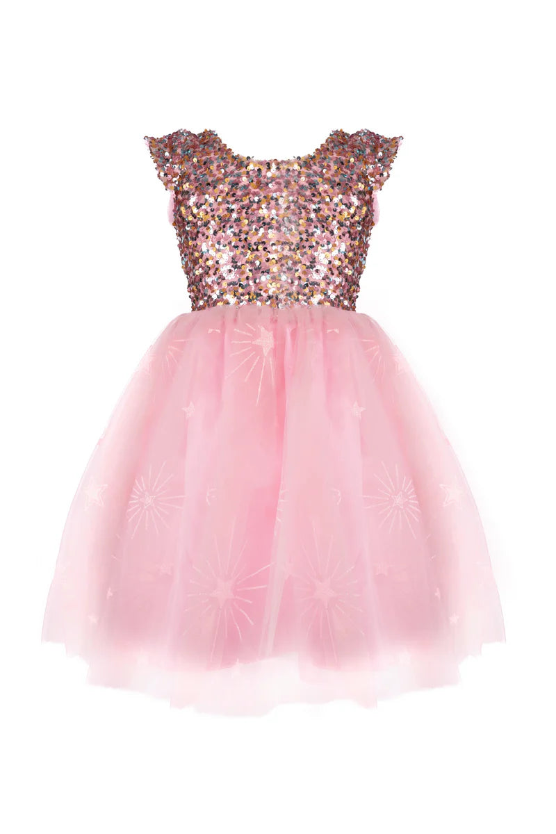 Flowing from the glittering top is a dreamy pink tulle skirt, scattered with shimmering pink stars that add a touch of whimsy and wonder. The soft, layered tulle sways beautifully with every twirl, making it just right for dress-up days, birthdays, or simply feeling fabulous.