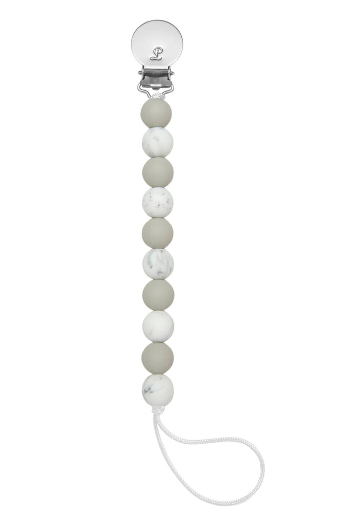 Our Lolli pacifier clip is the original silicone pacifier clip available in a range of gorgeous colors. The clip features ten rounded silicone beads for a teething-friendly design that engages and soothes. The stainless steel clip is rust-free, lead-free, and nickel-free and has plastic inserts to prevent damage to clothing—all rounded edges with no sharp corners. The clip measures 10" in length and is a great size for growing toddlers. Our clips are tested regularly at a government-accredited lab to meet and exceed safety standards.