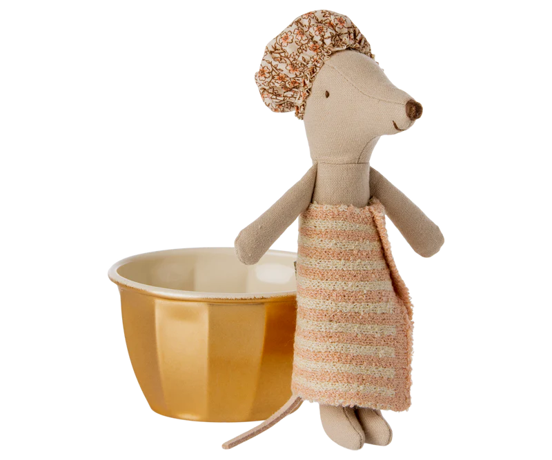Rub a Dub Dub there is a mouse in the tub. Ms. Mouse gets squeaky clean in the tub, but her ears stay dry with her shower cap. She uses a cute gold metal cup for her tub. Every mouse needs a spa day!