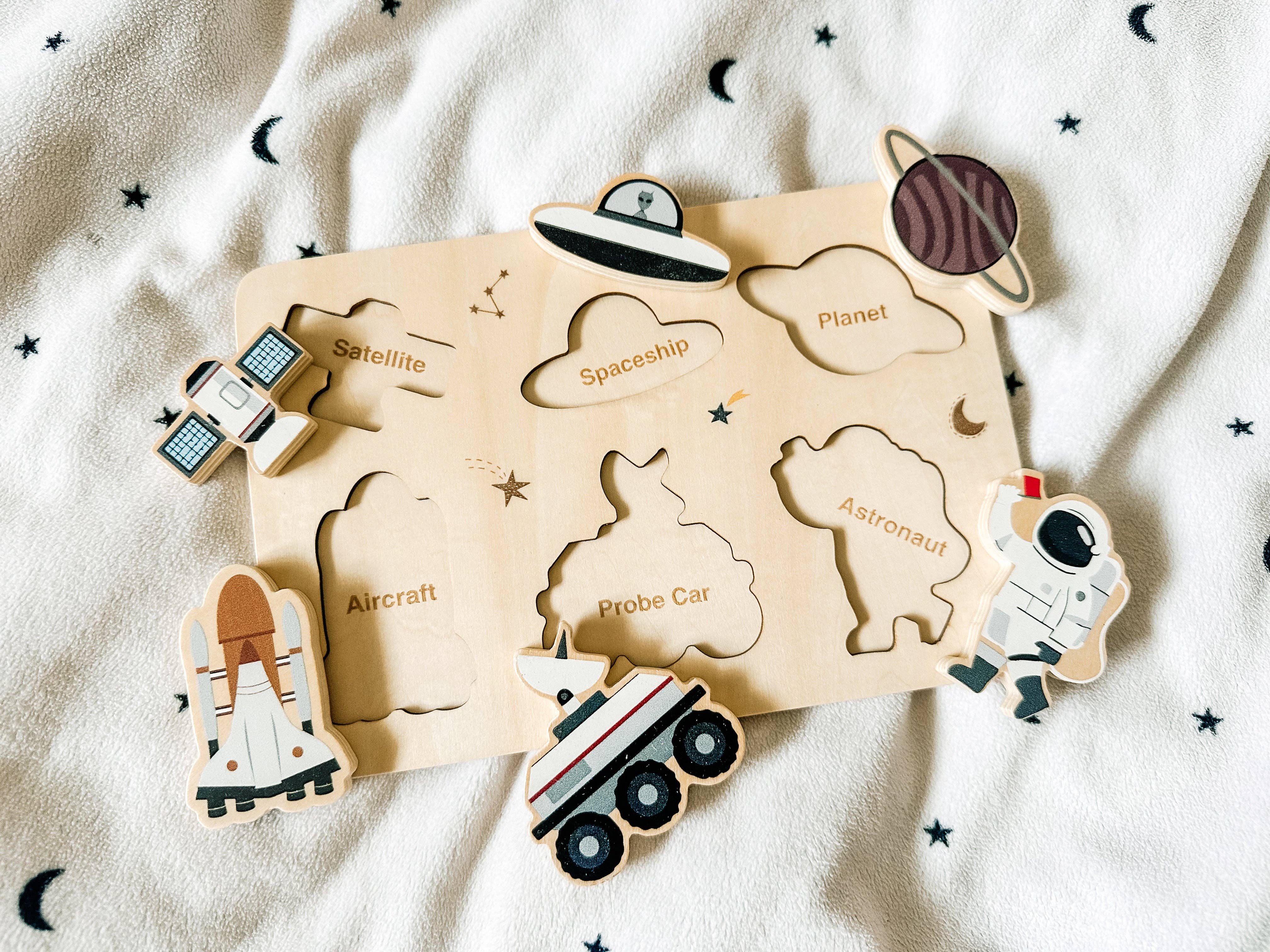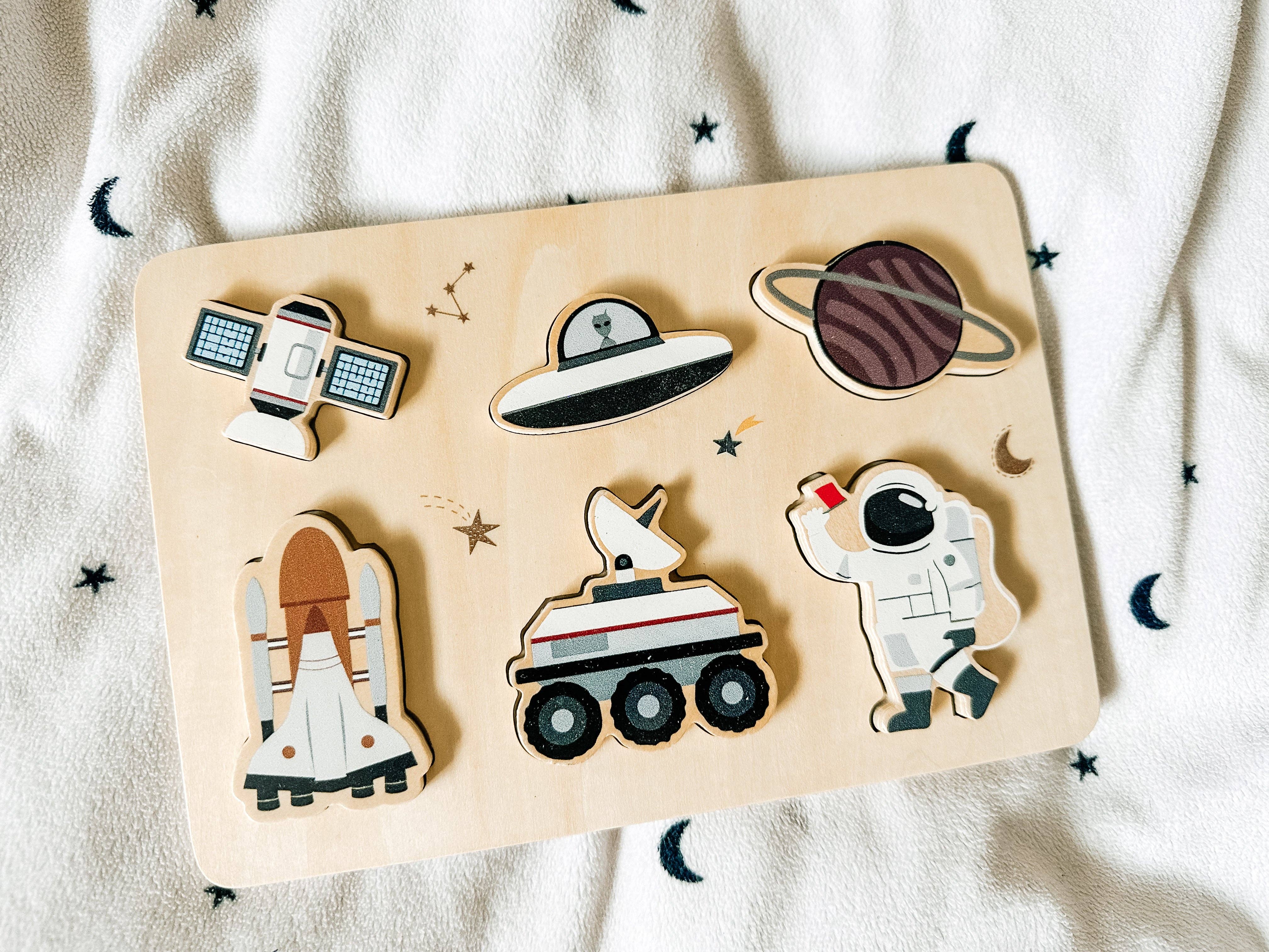 Get ready for an out-of-this-world adventure with this exciting space-themed wooden puzzle! Featuring six chunky pieces—an astronaut, space shuttle, satellite, Mars rover, planet, and even a UFO—this puzzle is perfect for little explorers eager to learn about the wonders of space.