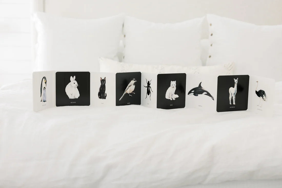 A 3-Book Box Set of High-Contrast Art for Visual Stimulation at Tummy Time. Featuring high-contrast art that is specially designed for a baby's visual development, this box set of three accordion-style board books will aid your baby’s visual development during tummy time!