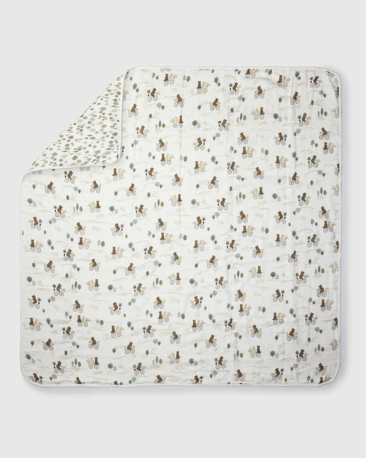 Our muslin quilts made from four layers of bamboo and cotton muslin fabric offer the perfect amount of breathable warmth and coziness to keep the baby comfortable and relaxed. This large reversible blanket is lightly quilted and features hand-drawn watercolor prints.