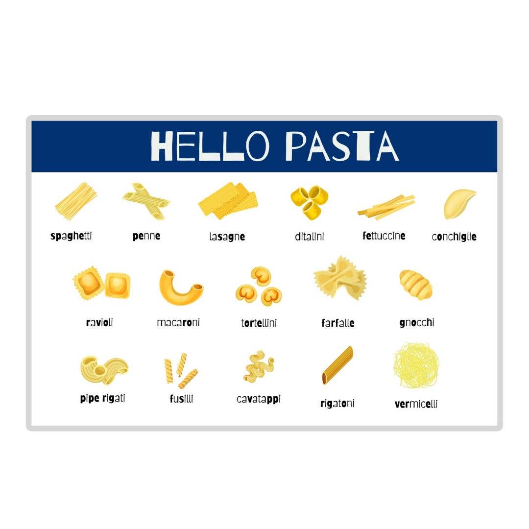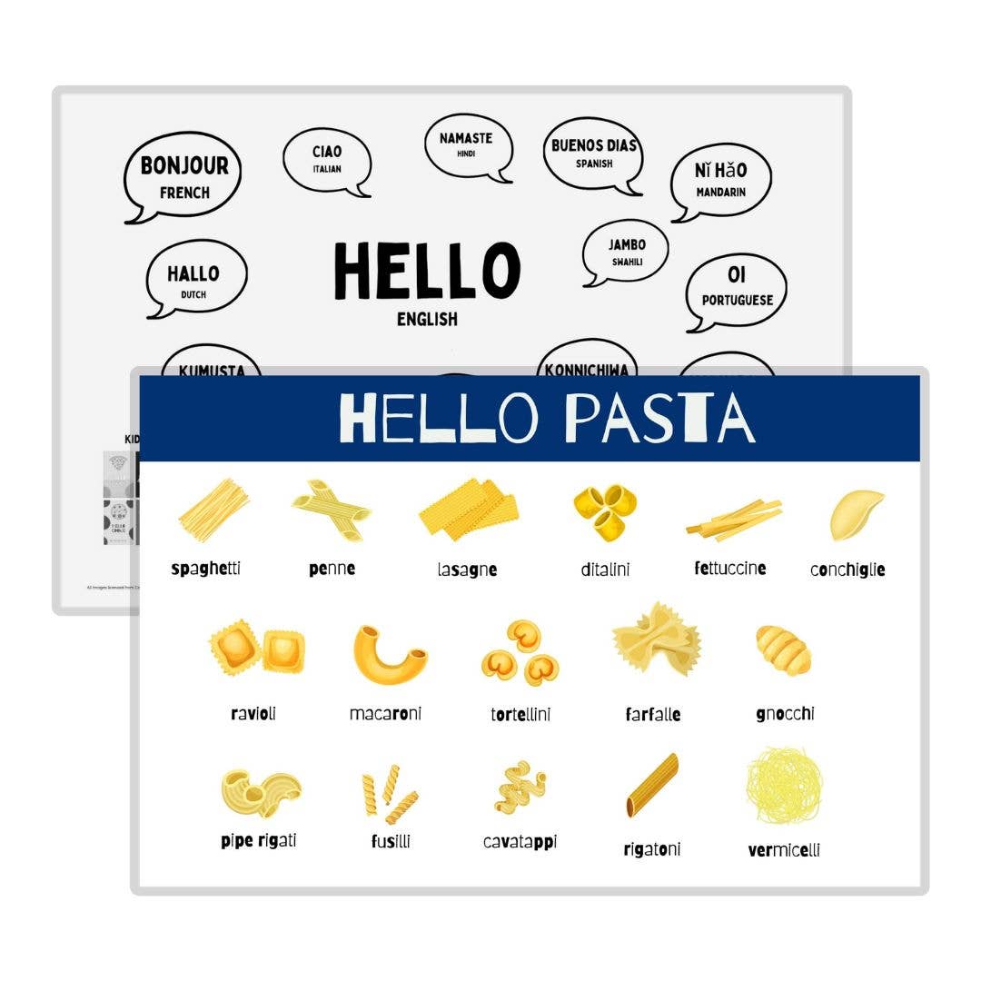 Fun, educational double-sided pasta placemat! Kids can explore types of pasta and learn greetings from around the world.