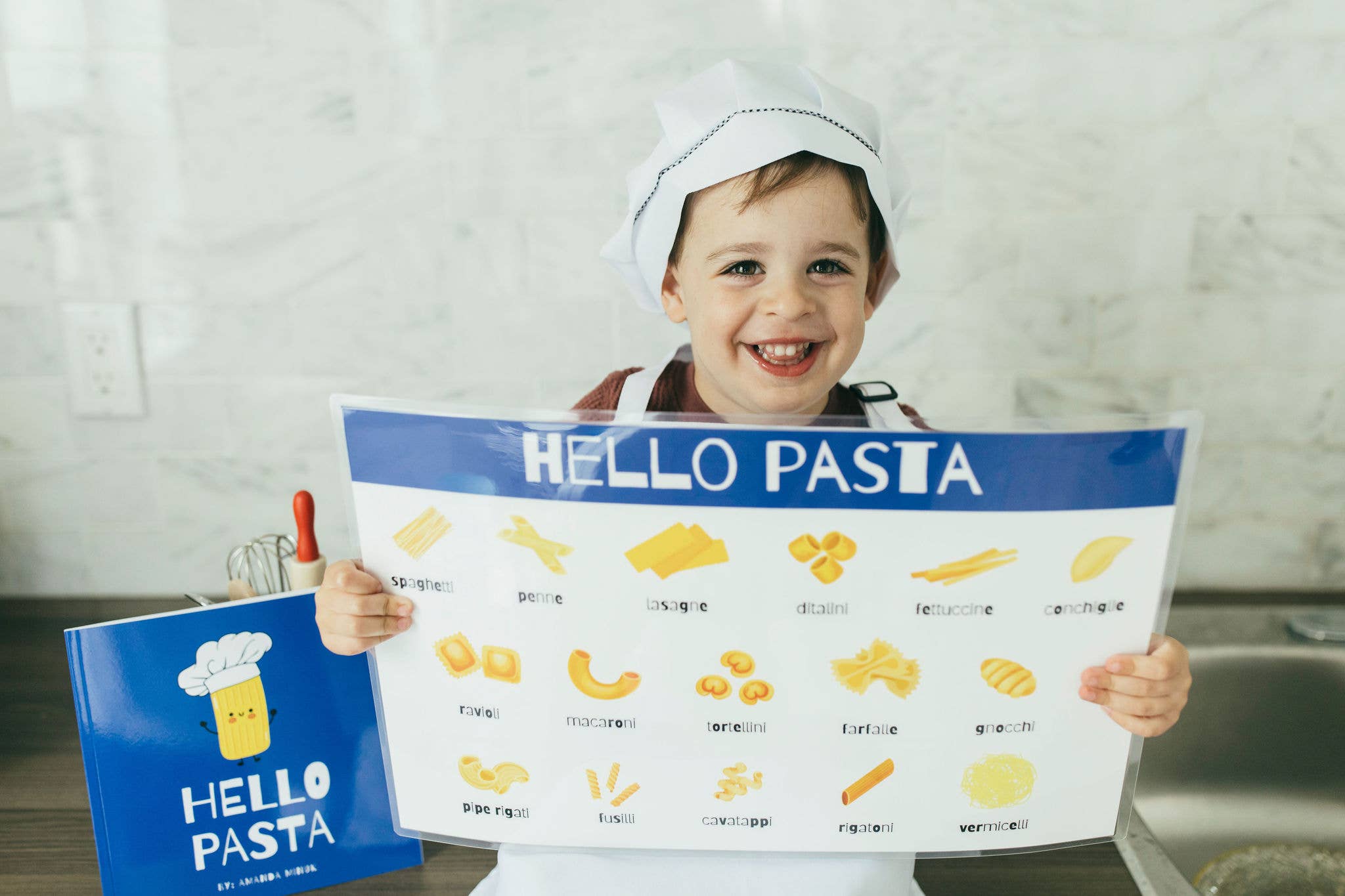Kids can discover fun pasta shapes like spaghetti, ravioli, and fusilli — then flip it over to learn how to say “Hello” in languages from around the world.