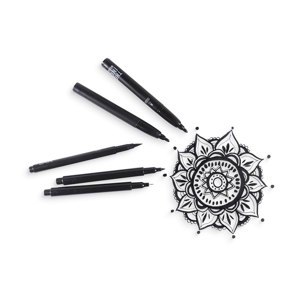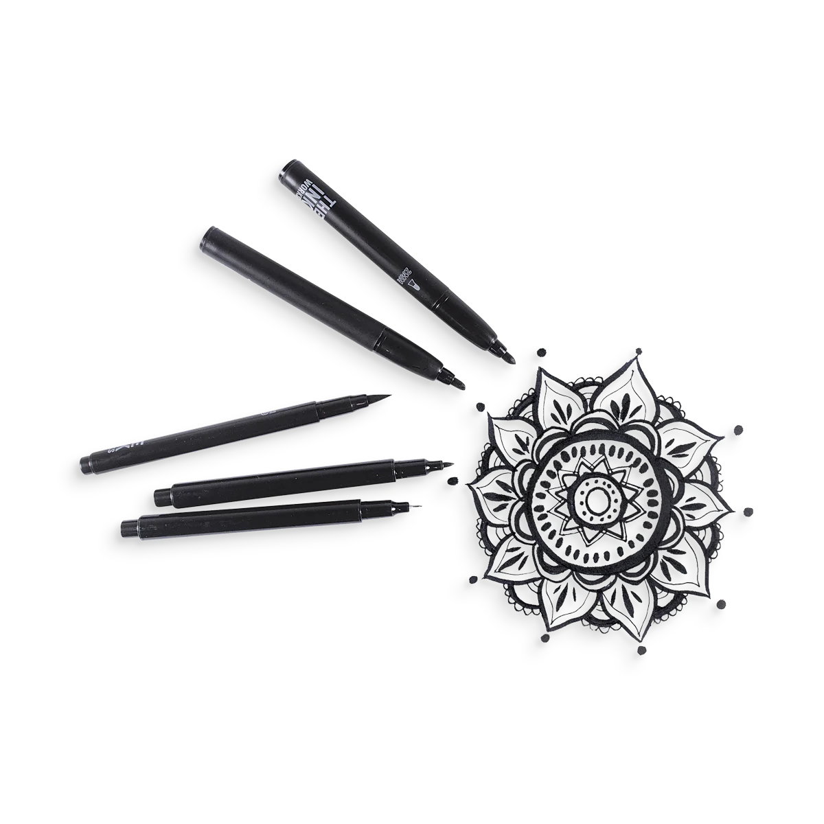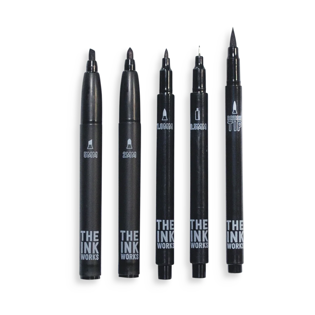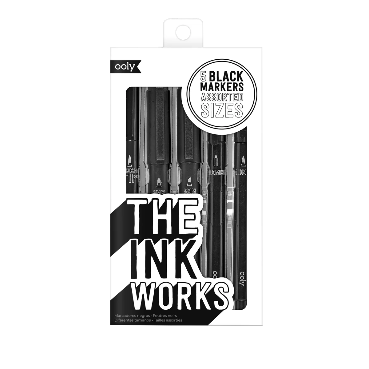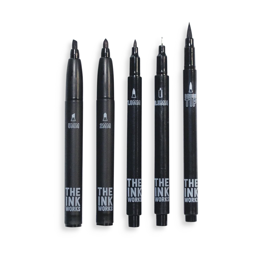 This marker set is for all the artists out there who work in black ink; finally a single set of every marker you need. The Ink Works Markers is a fully complete set featuring 5 black ink markers each with a different type of tip. Create masterful calligraphy, beautifully artistic brush strokes and even highly detailed sketches and fine writing all with just one set of black ink makers. In the set you'll find a 5mm chisel tip, a 2mm rounded tip, a fine brush tip, a 1.0mm tip and an ultra fine 0.5mm ultra fine tip. Also the ink in each markers is acid free.